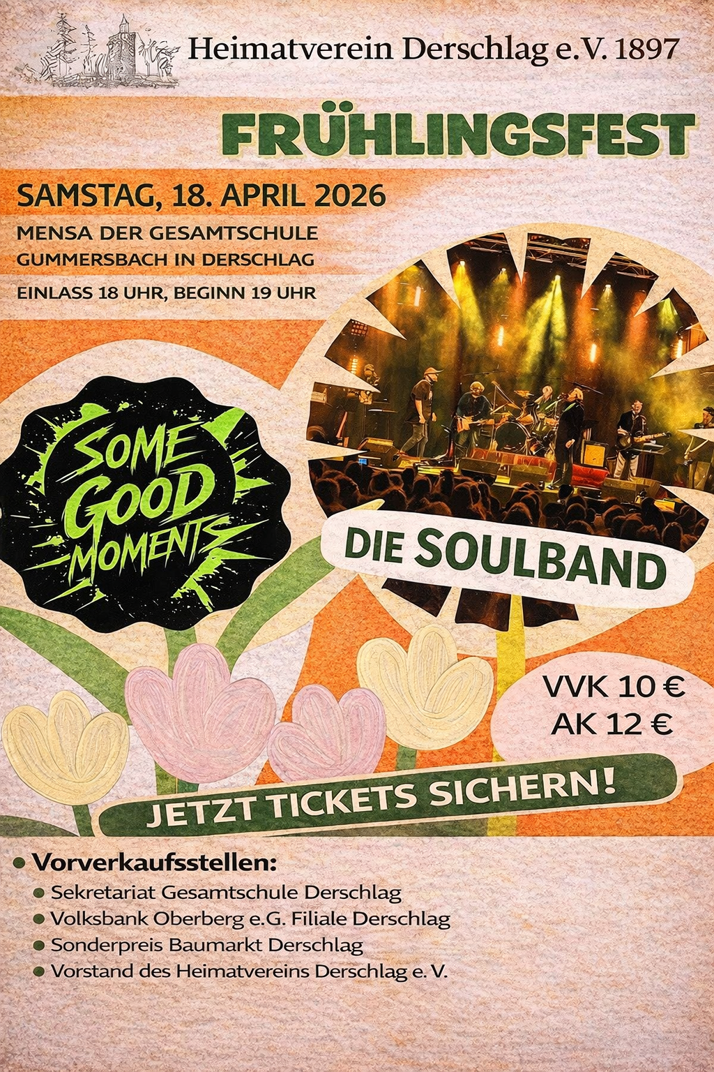 Der Heimatverein Derschlag e.V. 1897 lädt am Samstag, 18. April 2026, herzlich zum diesjährigen Frühlingsfest in die Mensa der Gesamtschule Gummersbach ein. Gemeinsam möchten wir einen Abend voller Musik, Begegnungen und guter Stimmung erleben.